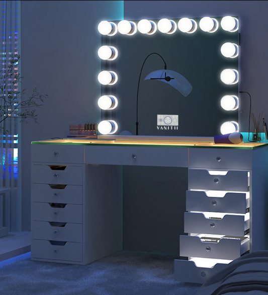 VANITII Eva Vanity Desk - 13 Storage Drawers with Full Light