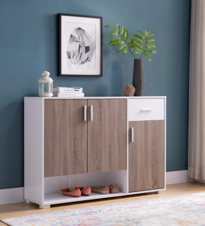 Expertly crafted with MDF and composite board, this shoe cabinet features a sleek white and dark taupe finish. Keep your shoes organized with three cabinet doors, one drawer on metal glides, and six cabinet shelves, while displaying your favorite pairs on the open shelf. Can hold up to 10lbs per shelf and 5lbs per drawer.