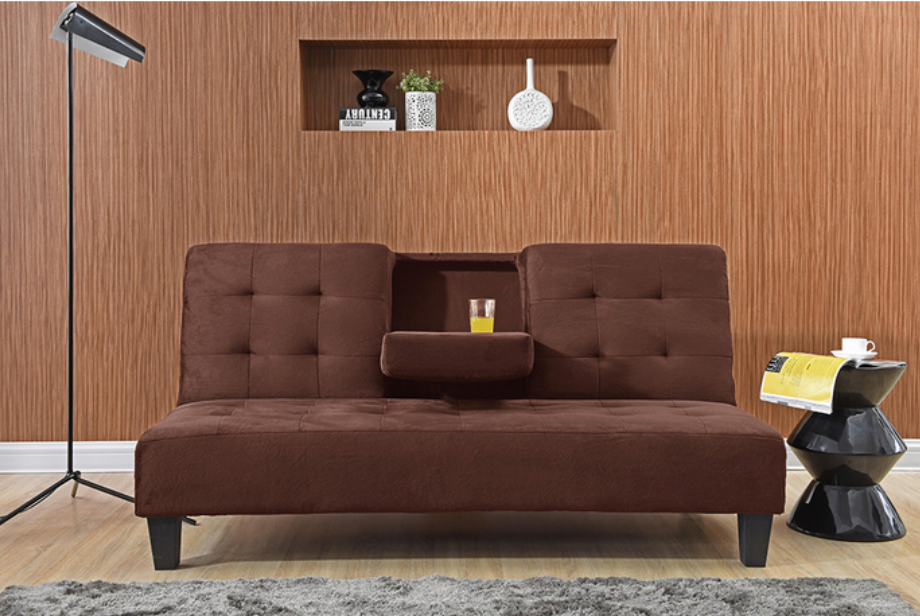 • Trendy Urban Style Practical Design • Dacron Fabric Upholstered Futon • Click-Clack Adjustable Convertible Armless Sofa Bed • Drop Down Back with 2 Cup Holders • Plastic Square Tapered Legs • Easy to Assemble • Maximum Weight Capacity: up to 500 lbs.