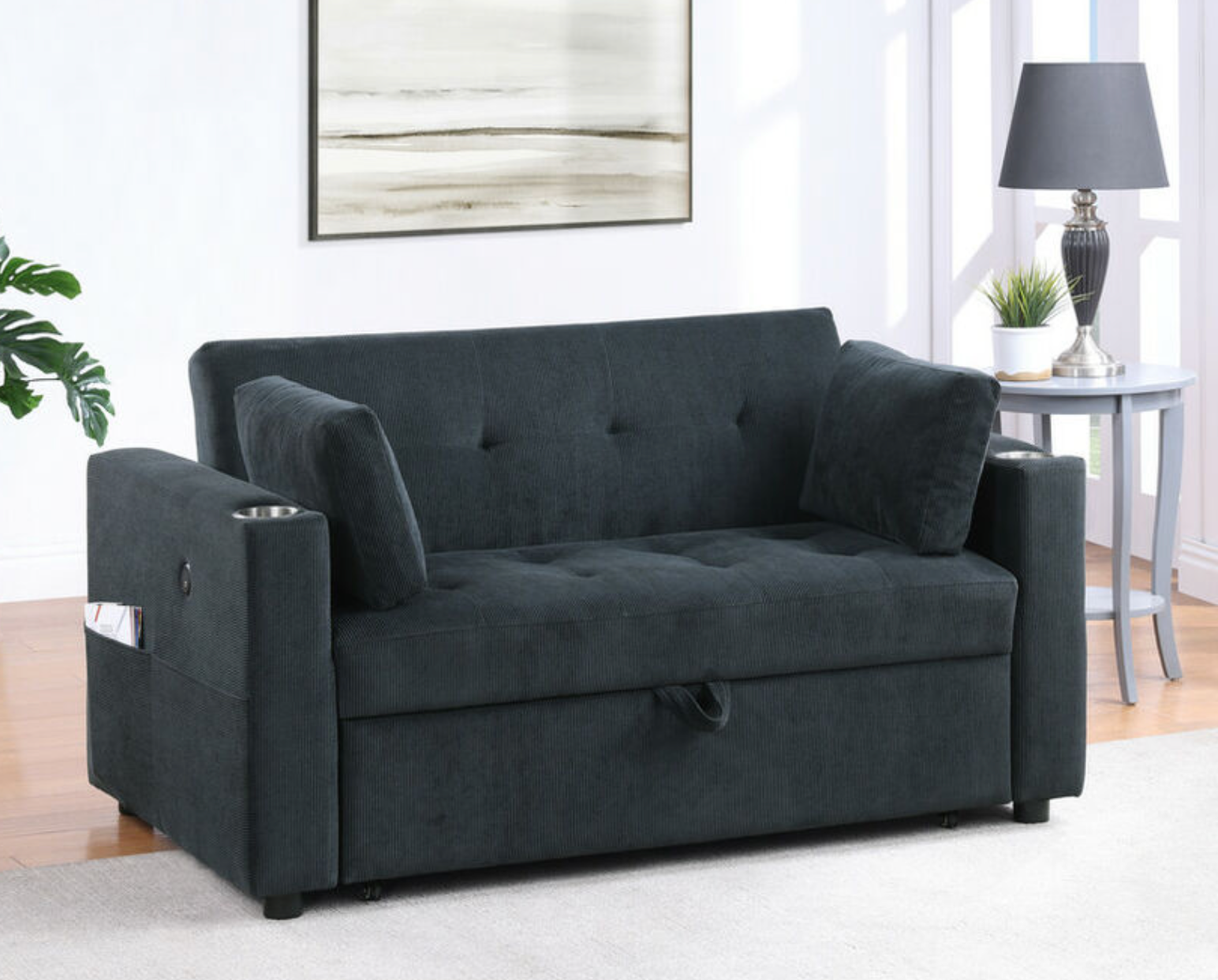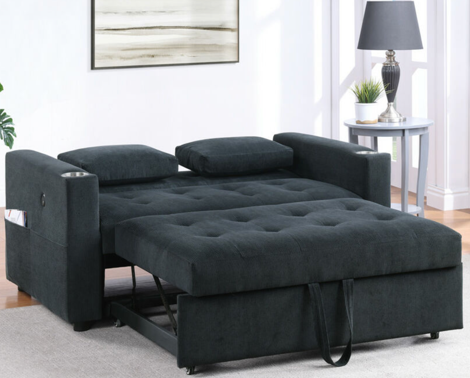 89340 Luelle 57"W Black Corduroy Convertible Sleeper Loveseat with Cupholders, USB Ports