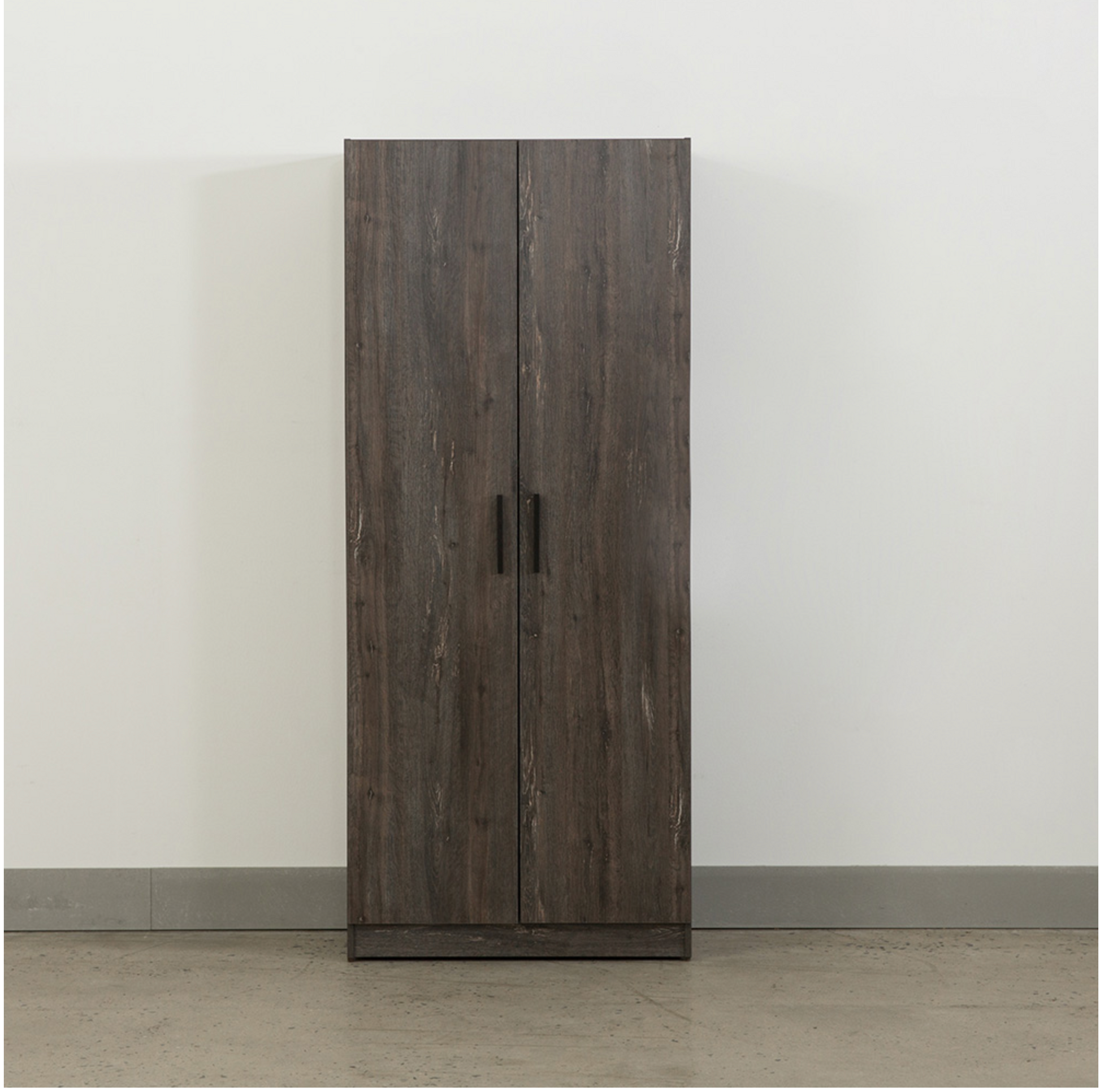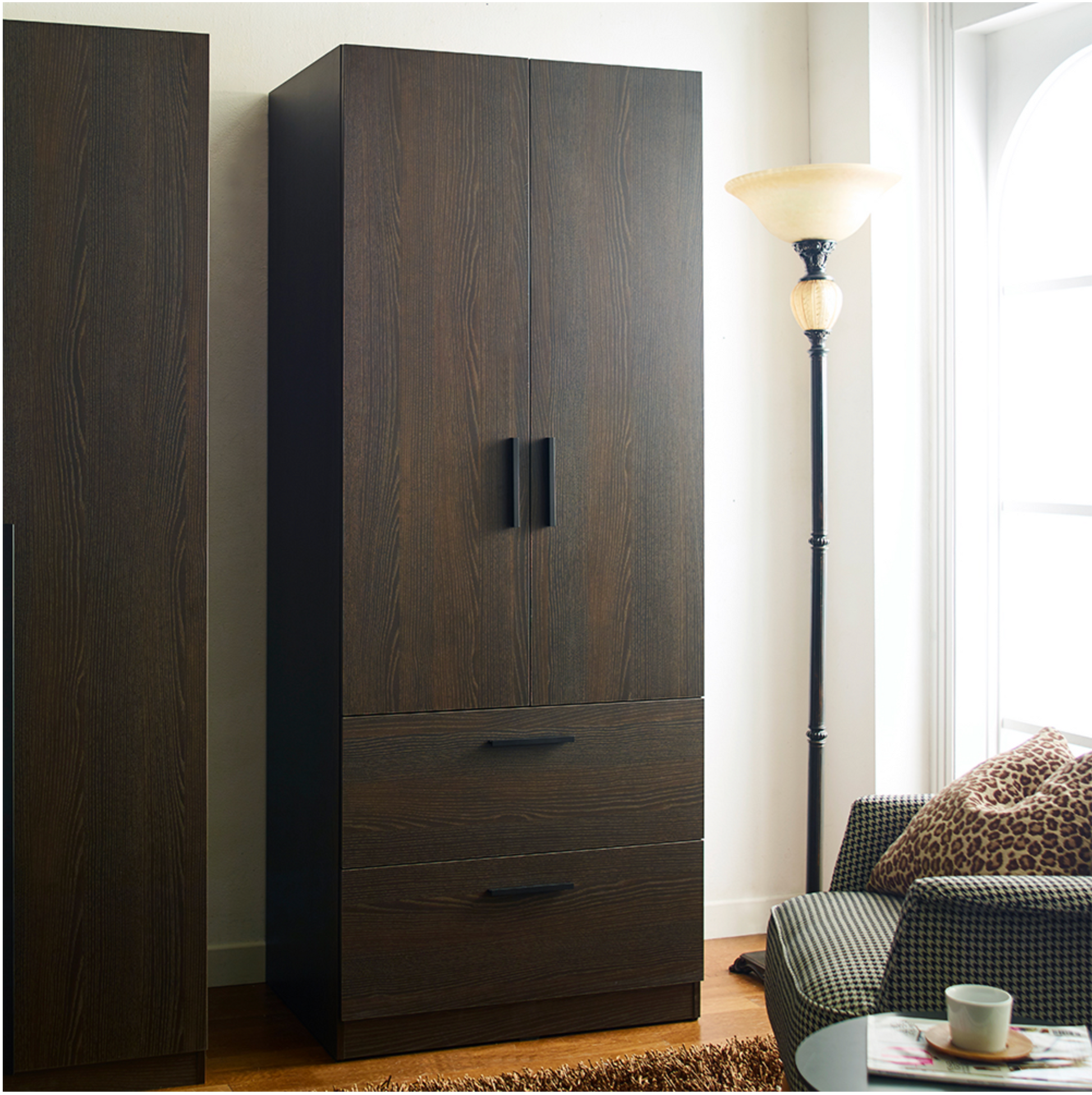 Feel confident with an organized dressing area by choosing this two-door wood closet with two drawers and hanging bars. Two large cabinet doors keep items concealed, while two lower drawers organize socks and other small essentials. A wood grain exterior and black bar pulls make this piece ideal for contemporary spaces.