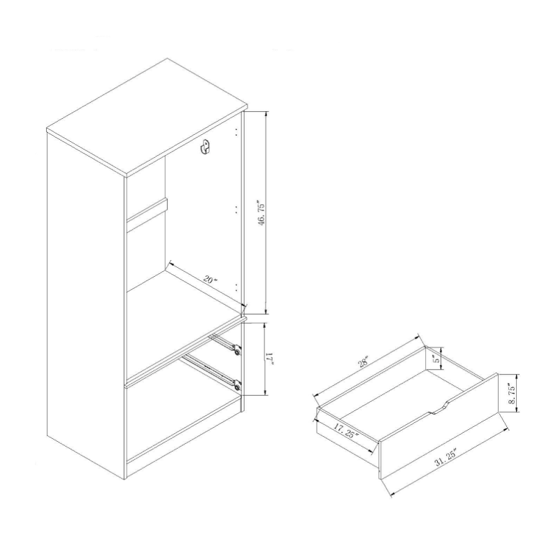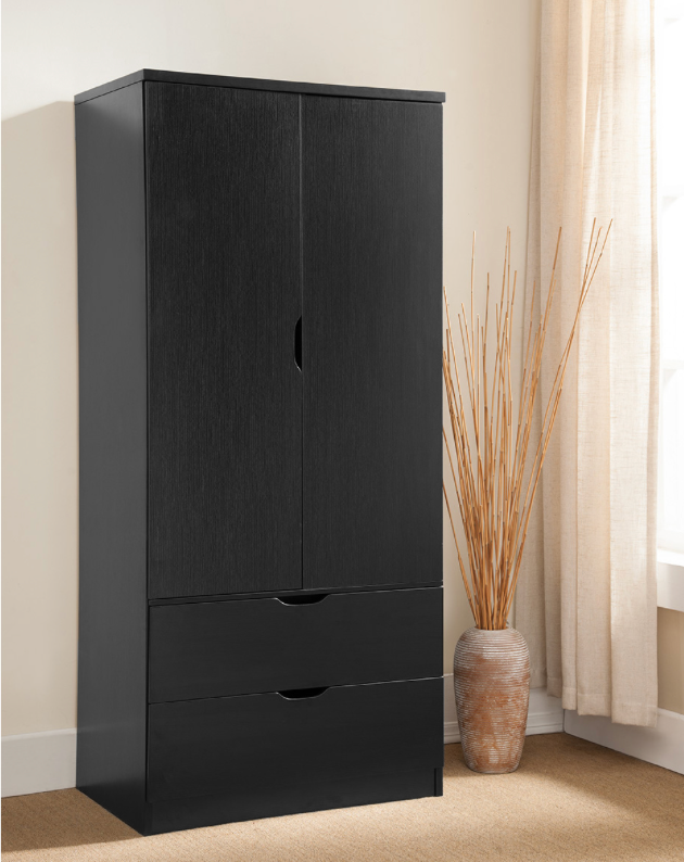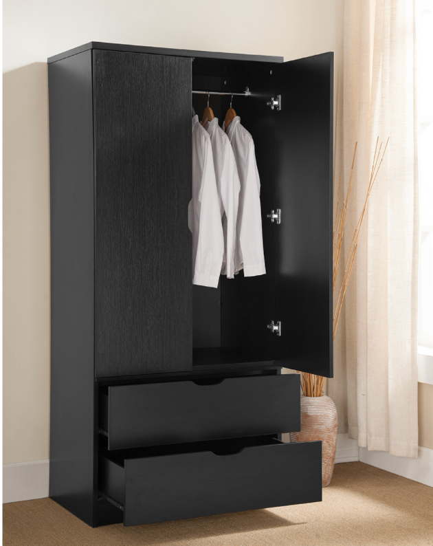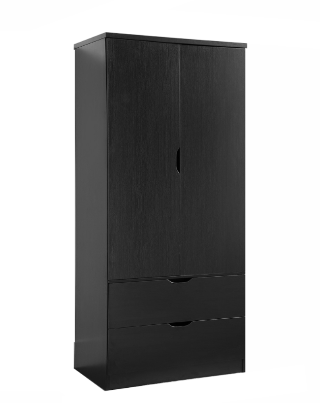 Introducing the BLACK3 WARDROBE, made from durable MDF and composite board with a sleek melamine laminate finish. Featuring two doors on metal euro hinges and two drawers on metal glides for easy access. The aluminum hanging rod can hold up to 30lbs evenly and the shelf and drawer can hold up to 10lbs and 5lbs respectively, giving you ample storage space.